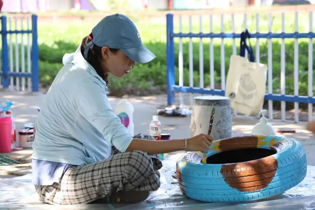来到小杜庄村,村民与党支部书记热情接待了学校pg麻将胡了试玩 实践团,并带领实践团成员了解了小杜庄村的发展历史与生态风光。在村中,实践团成员们观摩了各家各户墙面上的“绿水青山”“红色党史”墙绘,感受不一样的艺术之美。参观之后,实践团成员们运用课上所学的知识,通力合作共同绘制废弃轮胎,利用轮胎创作出一个个颇具风格与艺术美感的涂鸦绘画。红色党史、童趣绘制、球队涂鸦、街头赛车……不起眼的轮胎变成一件件精美而富有童趣的艺术装饰品。梧桐树下,一排美丽的轮胎摆放在菜园一侧,形成了杜家庄一道亮丽的风景线。艺术的介入为乡村社会带来了全新的文化体验,为小杜庄村的乡村文化振兴增添了色彩,为乡村旅游发展带来了助力。